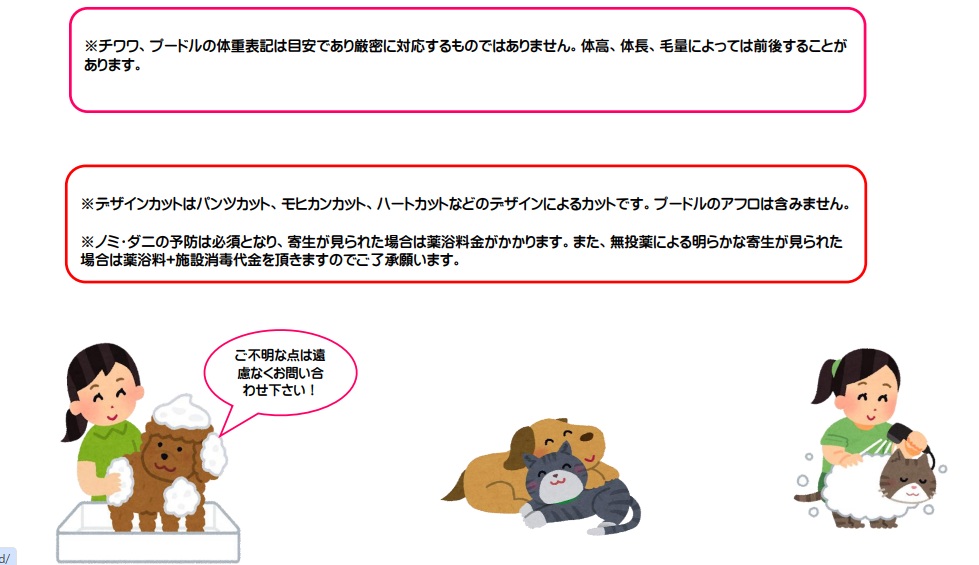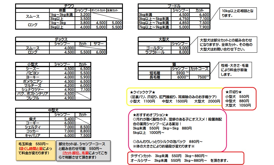 ・料金表に記載のないワンちゃん、その他料金については、お気軽にお電話またはメールにてお問合せください。